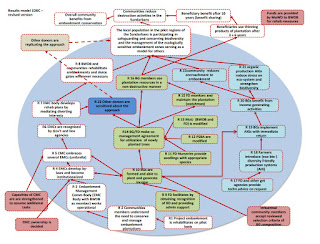An illustration of the possible complexity in applying the GIZ Results Model to projects is illustrated in one coastal zone biodiversity project, included in the notes by Eric J. Lacroix for a 2015 course on Project Management at Kulna University in Bangladesh. The results model looked like this (p. 35):